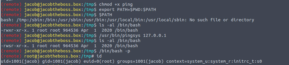 uid=1001(jacob) gid=1001(jacob) groups=1001(jacob) context=system_u:system_r:initrc_t:s0
